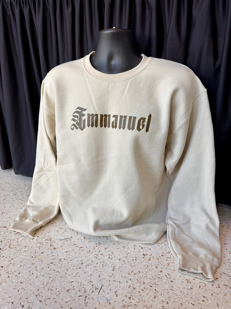 Light tan crewneck sweater with "Emmanuel" on the front in olive-green lettering. On the back is the classic GENTRI "G" in gold, along with the phrase "God With Us" in olive-green text.